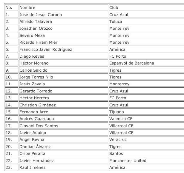 Entre los 23 futbolistas destaca la aparición de los naturalizados Christian Giménez y Damián Álvarez quien recientemente disputaron un amistoso ante Costa de Marfil. Por su parte, Carlos Vela y Guillermo Ochoa, dos elementos Aztecas que militan en europa y que han tenido actuaciones destacadas en las primeras fechas quedaron fuera de la lista final.
